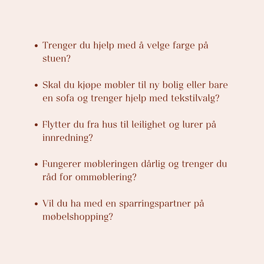 Med KÅK har jeg som mål og lidenskap å gjøre interiørhjelp enkelt og mer tilgjengelig. Gjennom personlig, effektiv og prisgunstig service, er jeg klar for å hjelpe deg med å skape et hjem som får deg til å smile. Jeg hjelper deg uansett prosjektstørrelse og tilbyr både fysisk og digital konsultasjon.